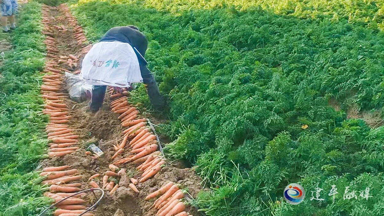近日,建平县哈拉道口镇嘎岔村田间地头一派繁忙景象。连片的胡萝卜地里,收割机穿梭作业,村民们忙着分拣、装袋,红彤彤的胡萝卜堆成小山,丰收的喜悦溢满田垄。